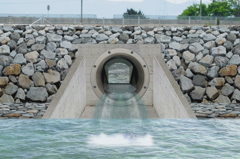 바닷물 역류방지, 하천의 통관, 하수도의 역류방지에 설치되는 무인무동력수문은 비상시에는 문짝이 부력에 의해 닫히고, 중력에 의해 열리는 기술입니다.